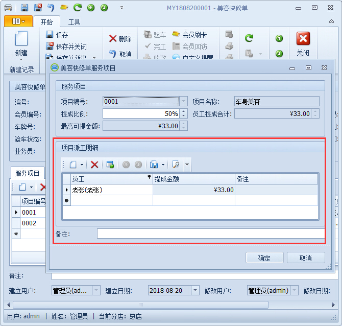 ②不同的服務(wù)項(xiàng)目可能需要不同的師傅來(lái)完成,則需要多次做項(xiàng)目派工,如下二圖: