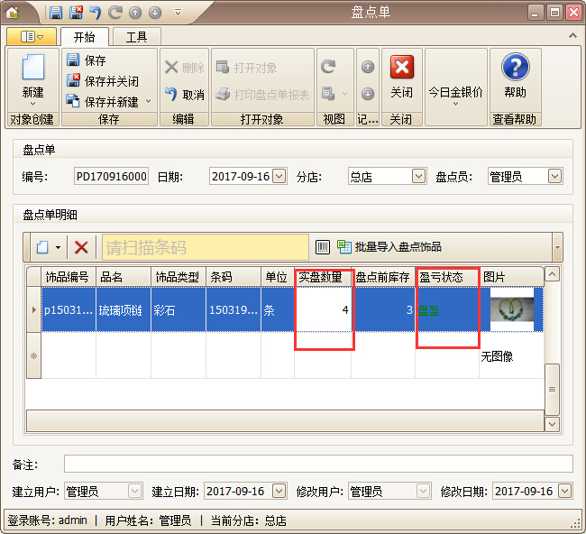 ②手工盤點(diǎn)完成之后,在珠寶管理系統(tǒng)中新建盤點(diǎn)單,在系統(tǒng)中人工輸入實(shí)際盤點(diǎn)的數(shù)量。在盤點(diǎn)單中支持掃描手工盤點(diǎn)單上的飾品條碼自動(dòng)帶出飾品信息,輸入實(shí)盤數(shù)量即可,如圖: